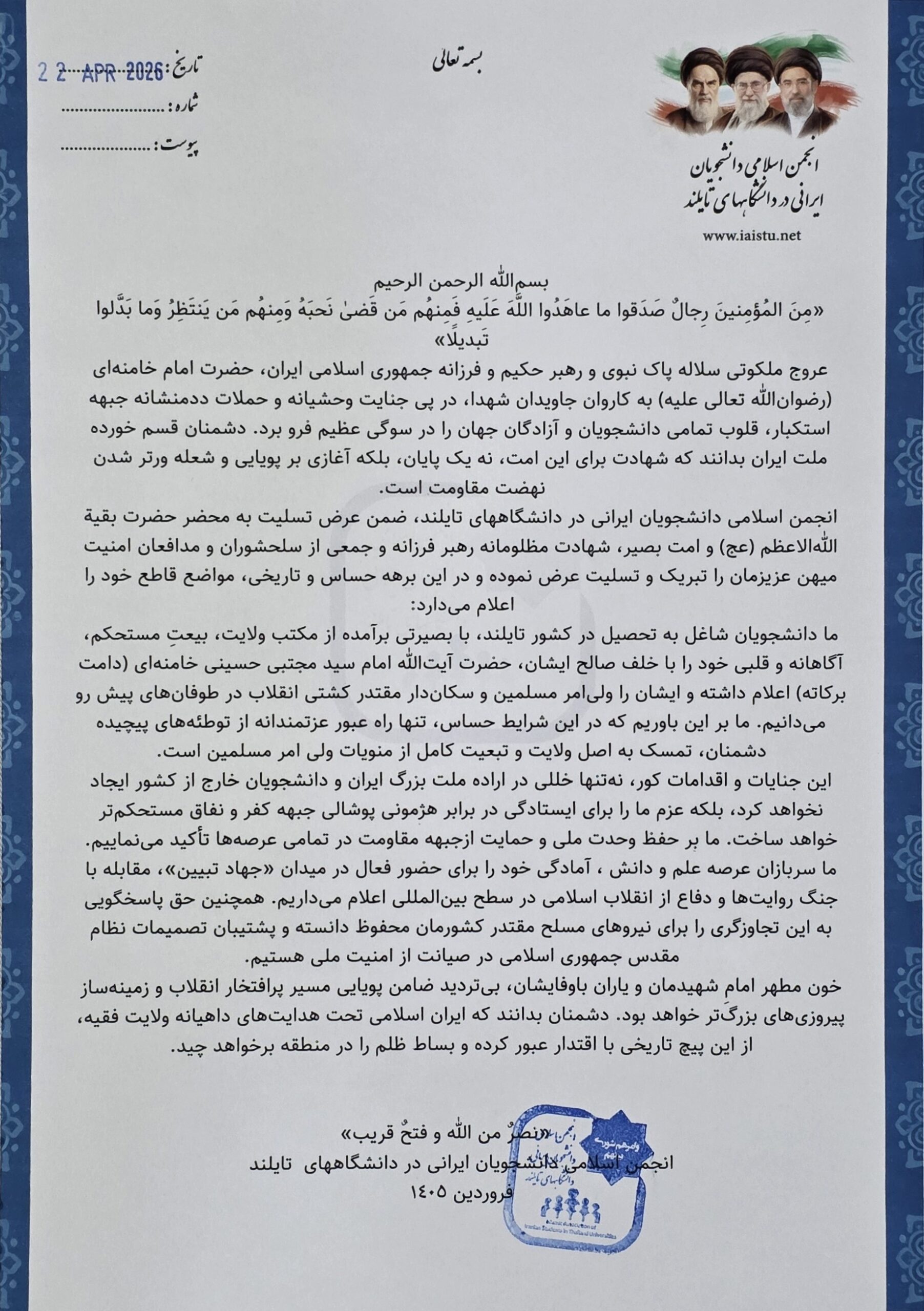 بیانیه انجمن اسلامی دانشجویان ایرانی در دانشگاه های تایلند